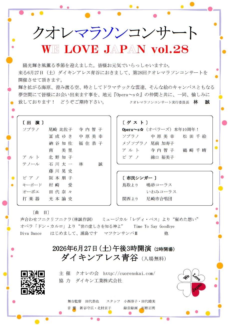 コンサート名称『クオレリレーコンサート〜歌にたくす心の絆〜』は平成23年3月11日に起きた東日本大震災の被災者へ義援金や支援金そして、コンサート関係者やお客様の心を届ける事を目的に、平成28年まで継続致しました。